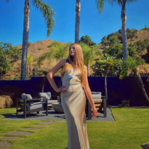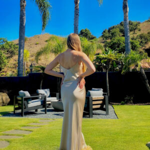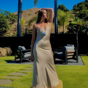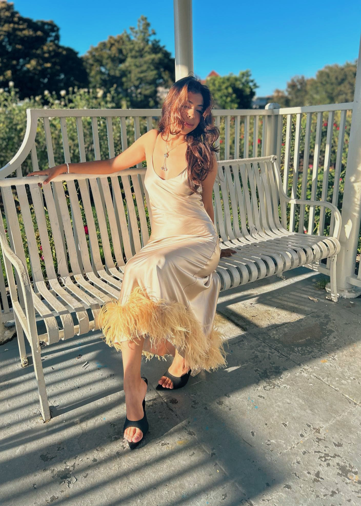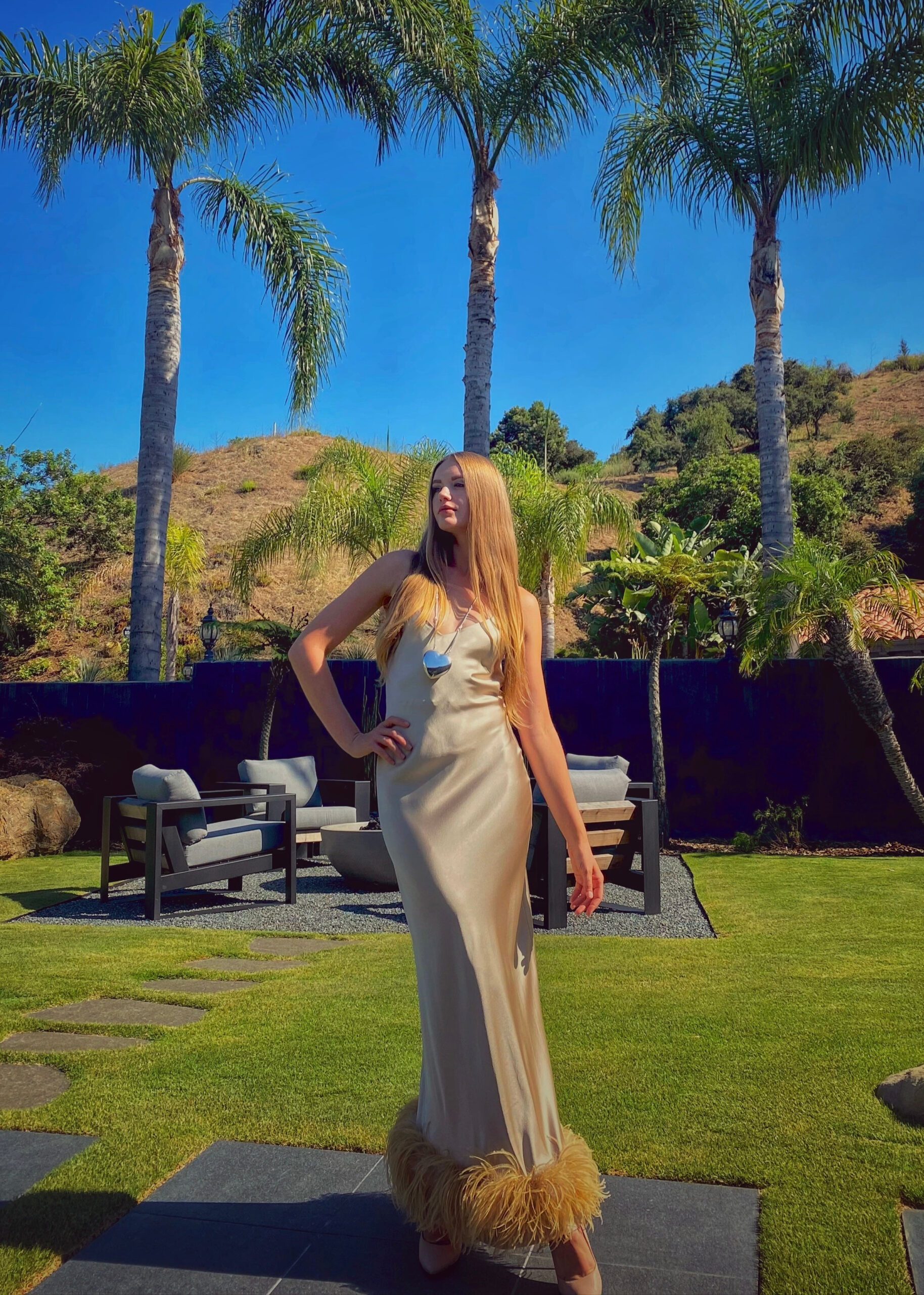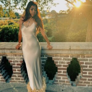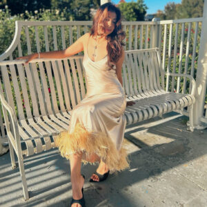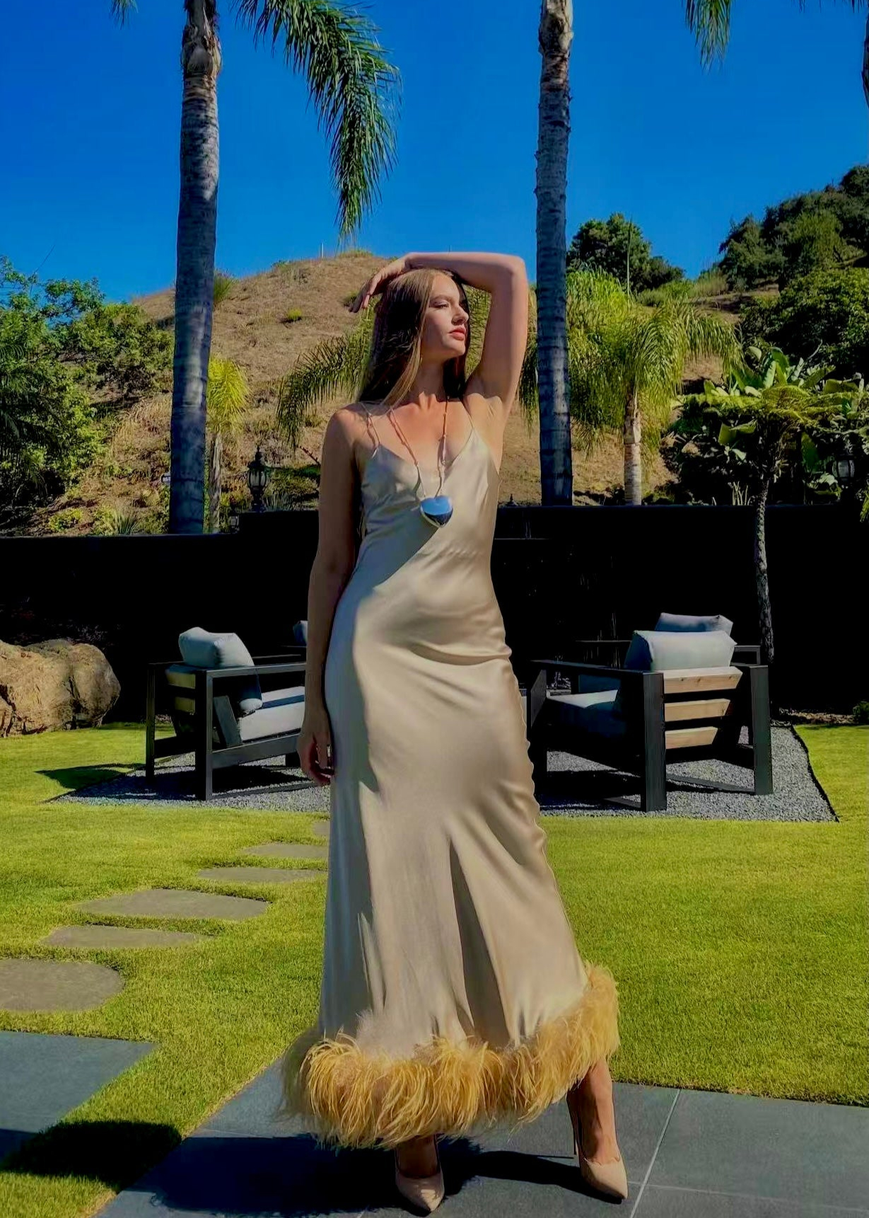 100% SANNIO.S Dragor Silk (30momme heavy weight silk) .100% ostrich feathers. Plunging neckline.