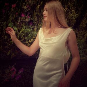 This plunging back silk bias cowl gown can be worn in a variety of ways, it has functional ties at the back of the neck and silk bottoms at the waist.